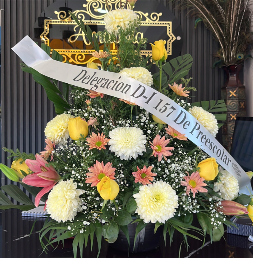 Arreglo funebre de piso rosas, margaritas pompones y lilys