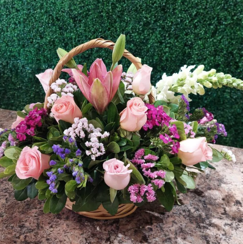 Canasta de rosas, perritos y Lilys con follaje