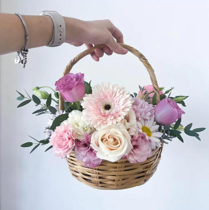 Canasta floral con rosas, gerberas y lisianthus