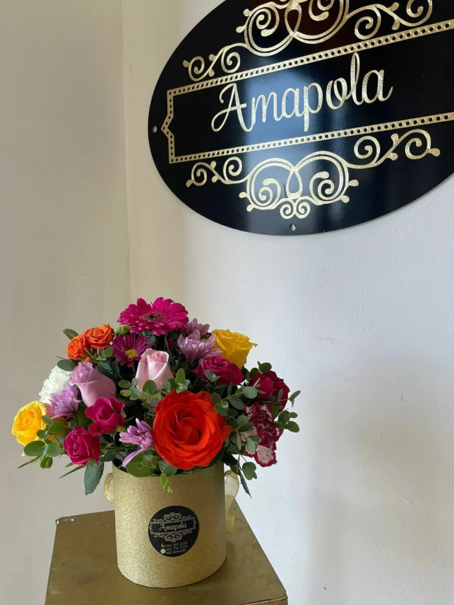 ¡Descubre nuestro impresionante Cilindro con Rosas, gerberas y mini rosas! Este arreglo floral es la elección perfecta para iluminar cualquier espacio...