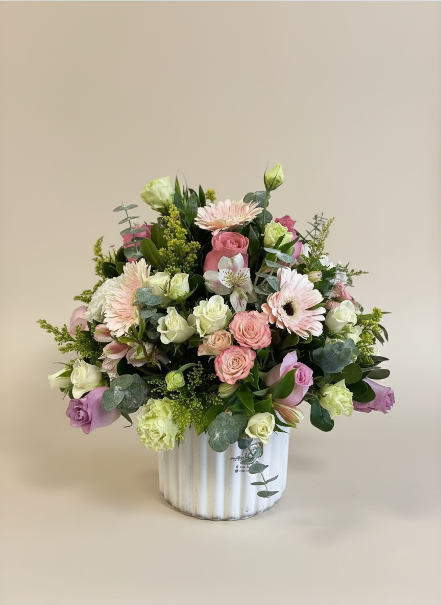 ¡Descubre nuestro encantador Cilindro mediano surtido con Rosas, Gerberas, Lisianthus y mini Rosas! Este arreglo floral es la elección ideal...