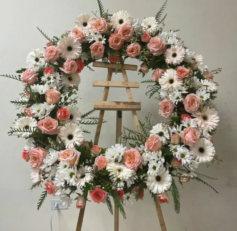 Corona de lujo grande con rosa inglesa, gerberas, rosas, margarita blanca y variedad de follajes finos Descubre la Corona de lujo...