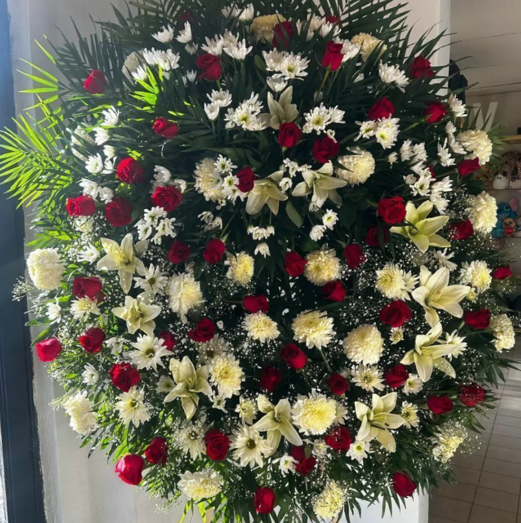 Corona Jumbo con 50 Rosas Rojas, Lilas Blancas, Crisantemos, Margaritas Blancas y Variedad de Follajes Descubre la Corona Jumbo, un deslumbrante...