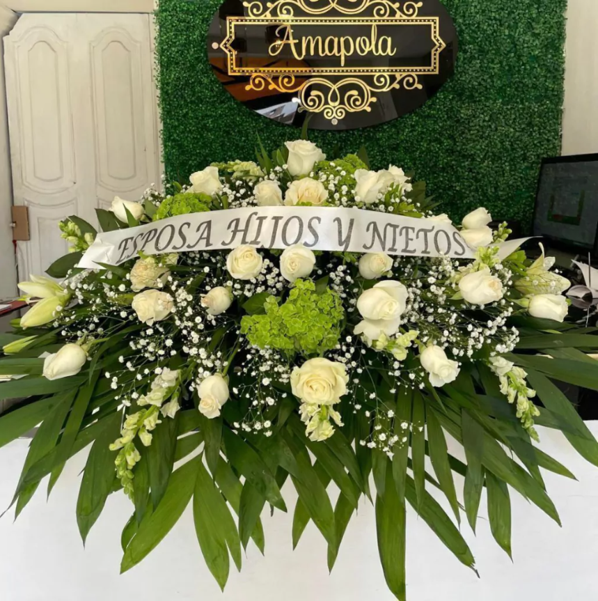 Cubre ataúd de lujo mediano con rosas blancas, perritos, hortensia, lilys y variedad de follajes Embellece el último adiós con...