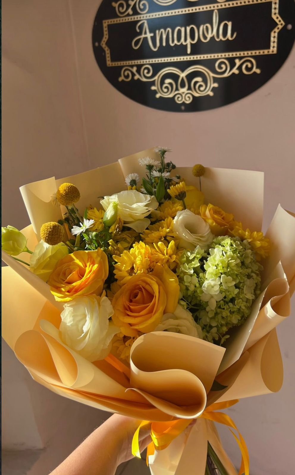 -Rosas amarillas, lisianthus, hortensia y craspedia