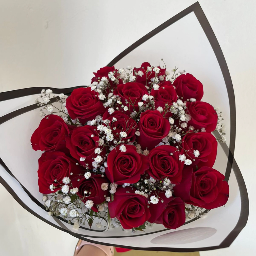 Ramo de 24 Rosas rojas con adorno de gipsofilia cantidad