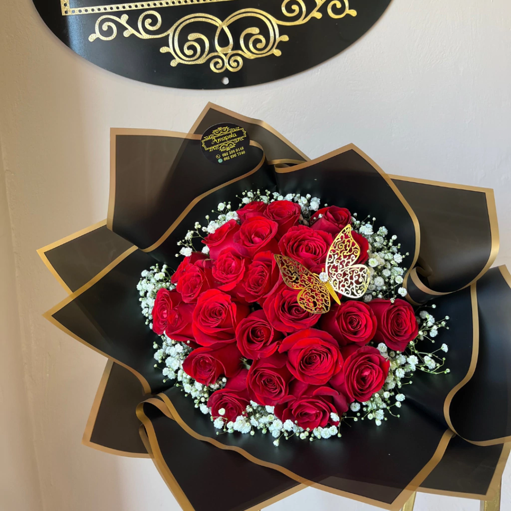 Ramo de 24 Rosas Rojas Contorneadas con Gipsofilia Déjate cautivar por la elegancia y el romanticismo de nuestro Ramo de 24 Rosas Rojas, cuidadosamente contorneadas...