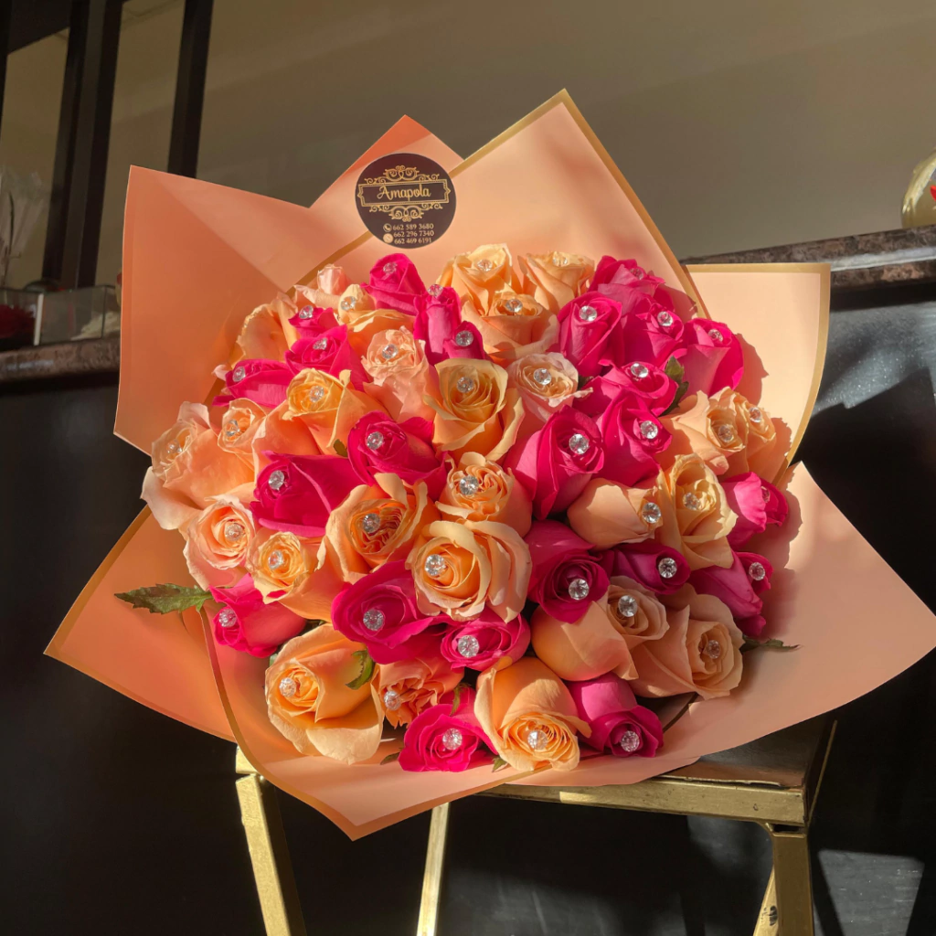 Ramo de 50 Rosas Rosas y salmon, con adorno de diamantes.