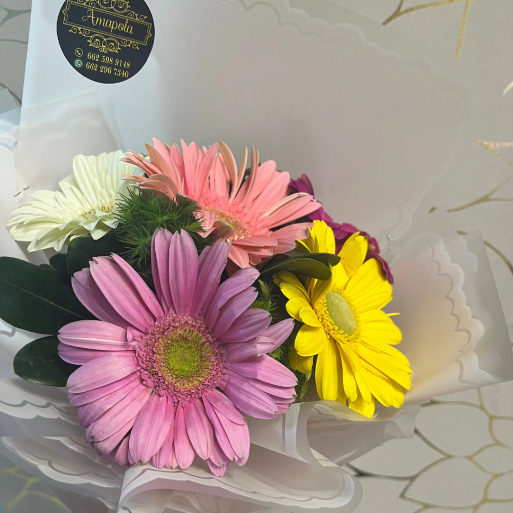 Ramo de 6 Gerberas de varios colores con follaje. cantidad